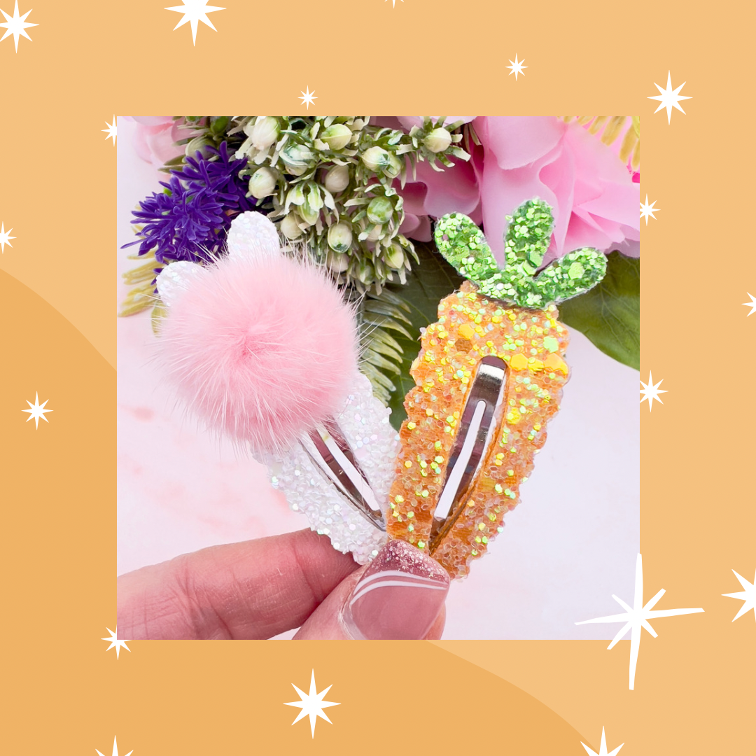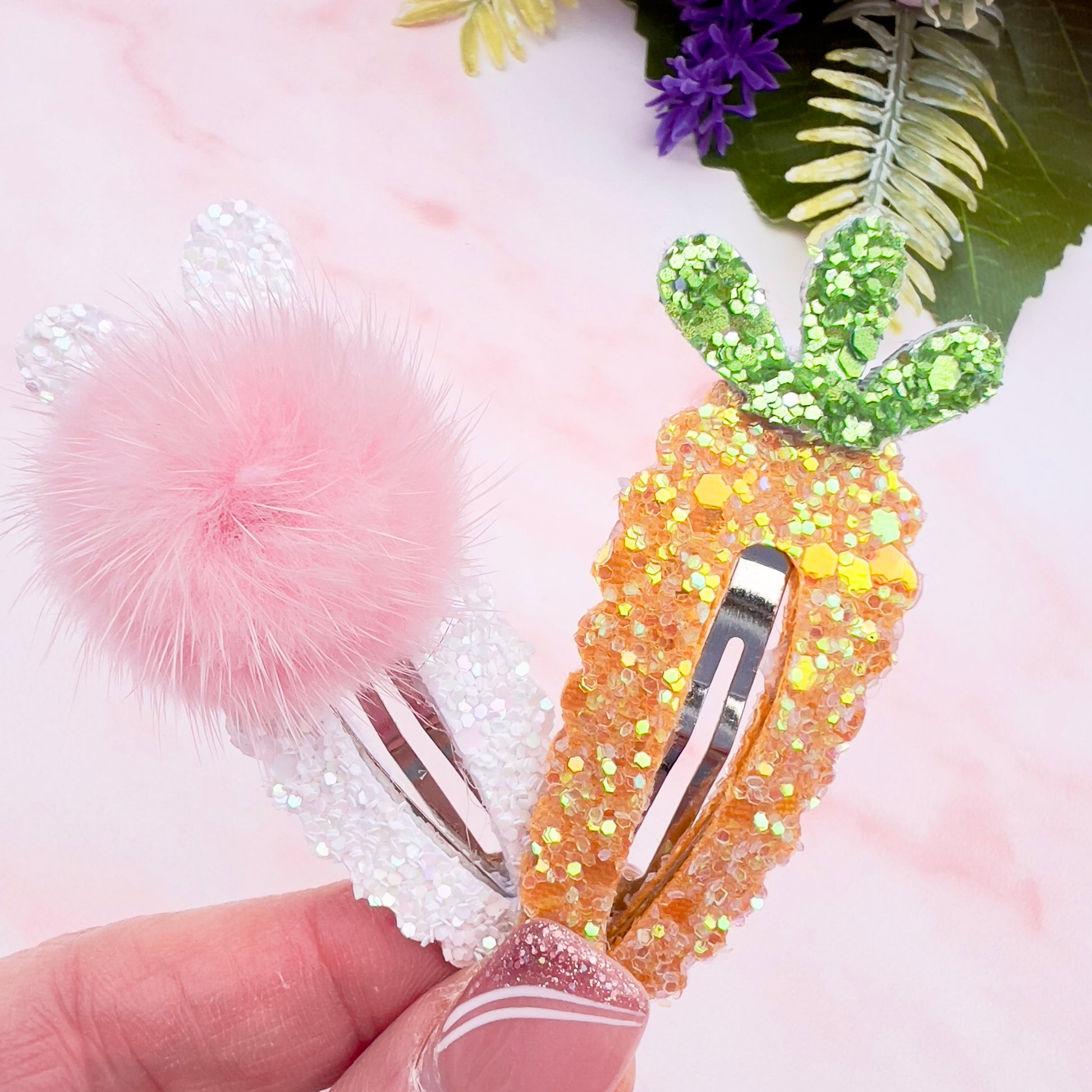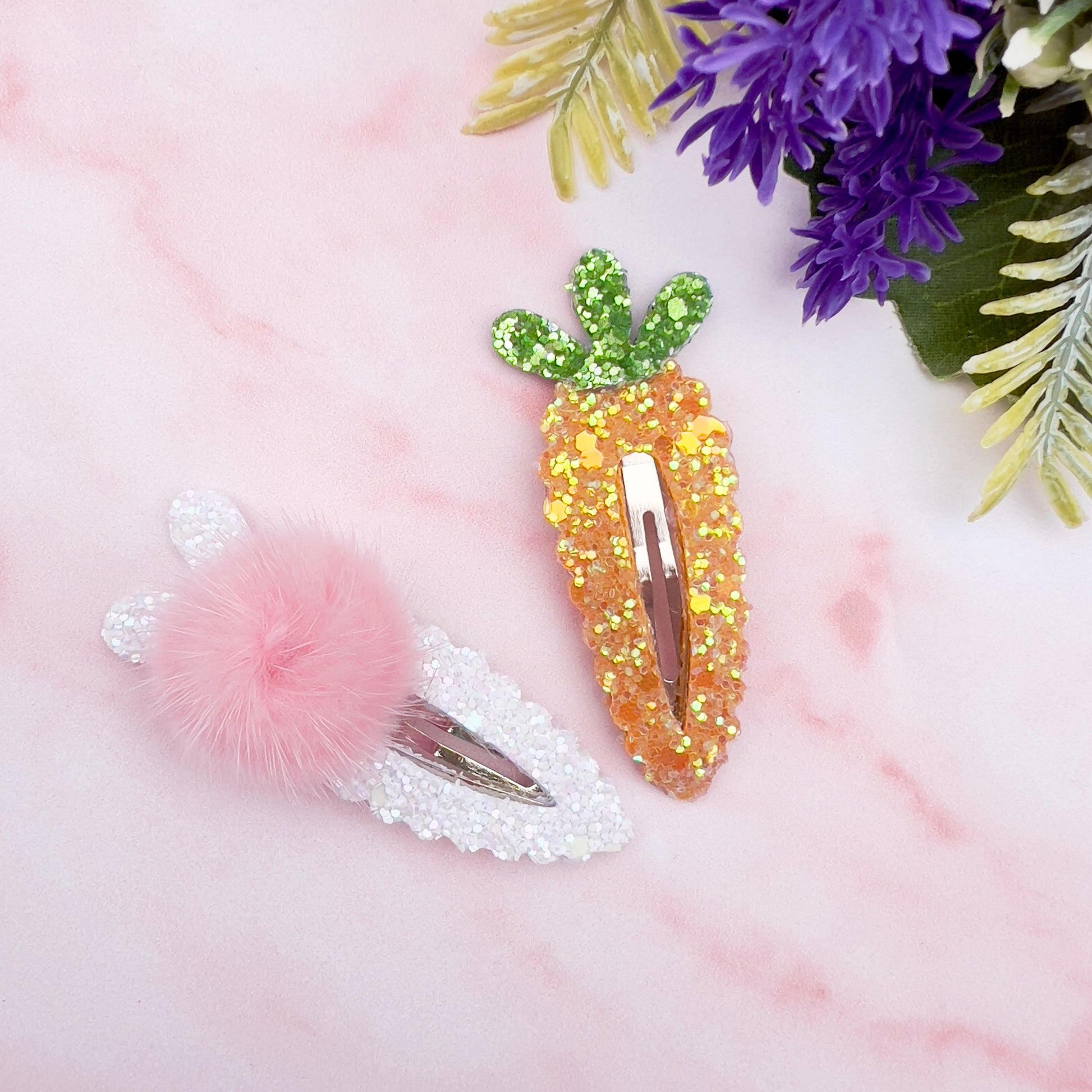 The clips measure approximately 3.5cm in diameter and the clip is 3cm long. The listing is for a set of teo hair clips one carrot and one bunny.
