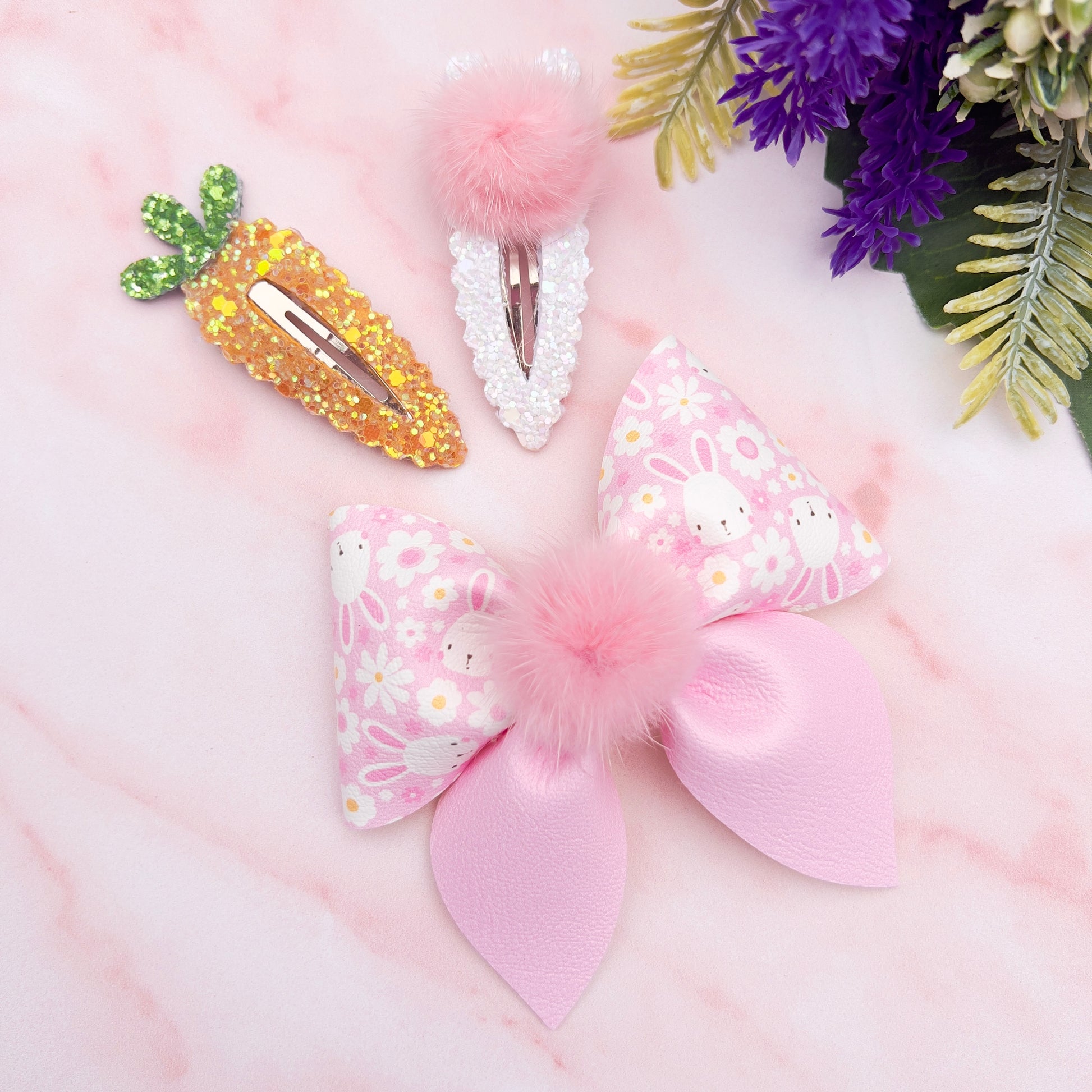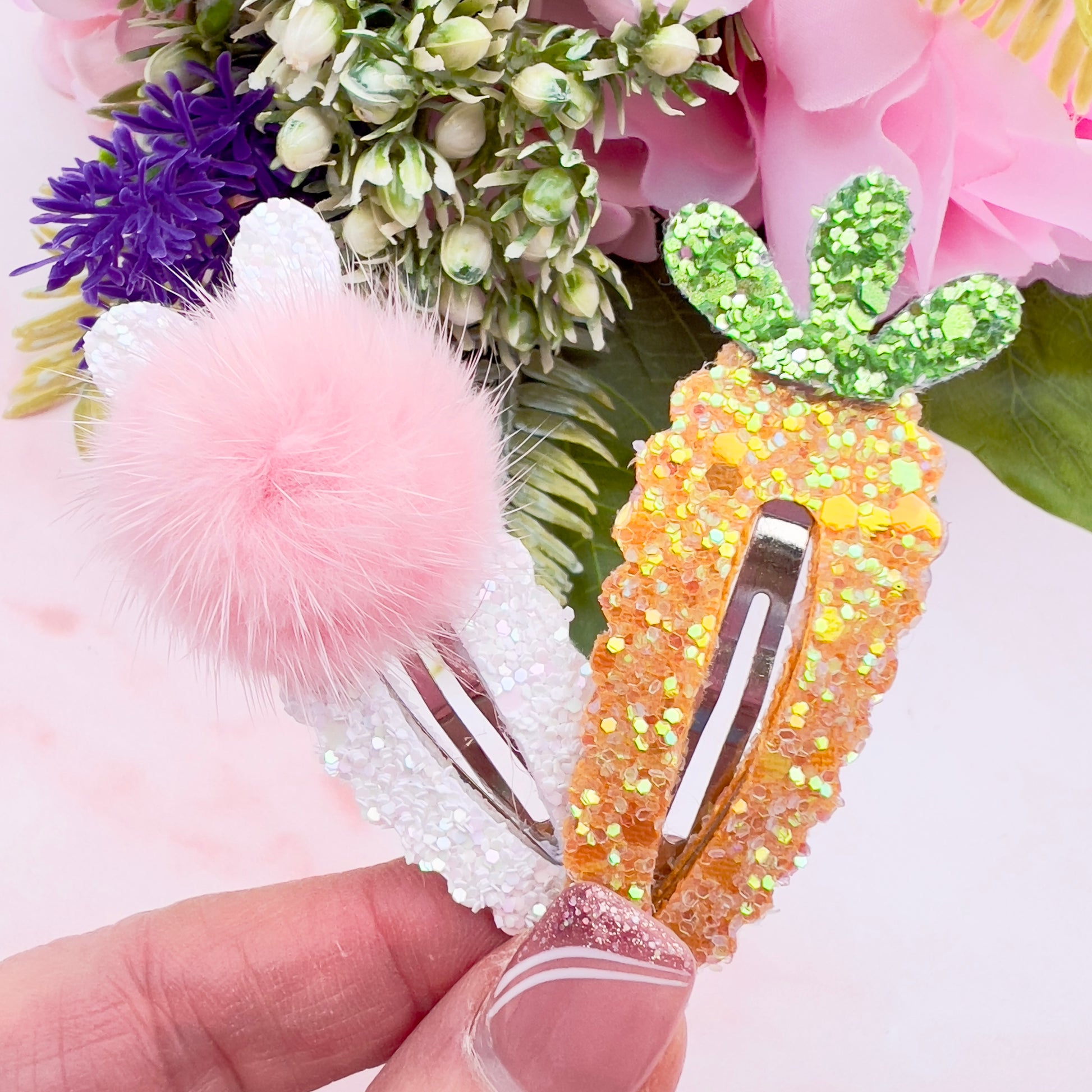 These adorable pretty clips are perfect for tiny toddler curls this Easter or a beautiful addition to any hair style! The clips are made from chunky glitter fabric with a coordinating Pom Pom attached to the clip.